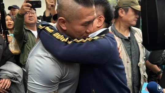 27日上午8:00,蔡正元前往台北地检署报道。画面显示,网红“馆长”前来送行,两人握手拥抱,随后道别。